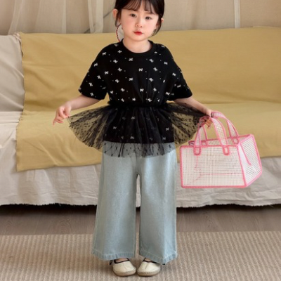 - [빠른수입] 블랙리본레이스티청바지셋
