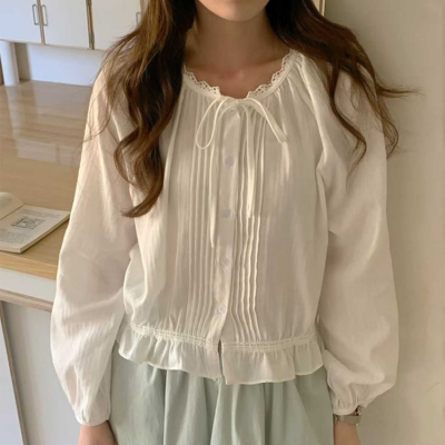 - on.[BL666]리본핀턱크롭블라우스
